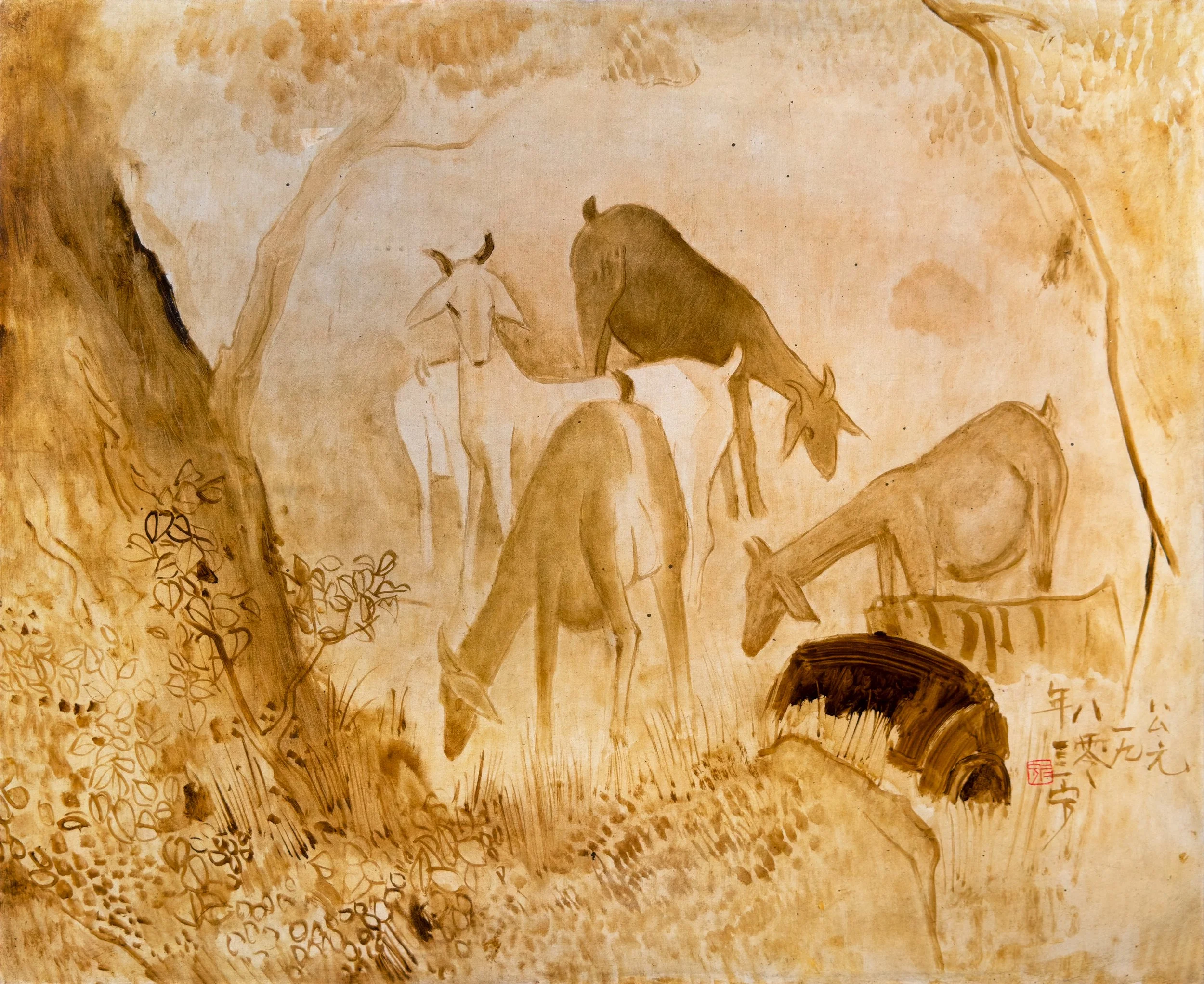 Chinese ink and colour on rice paper mounted on jute